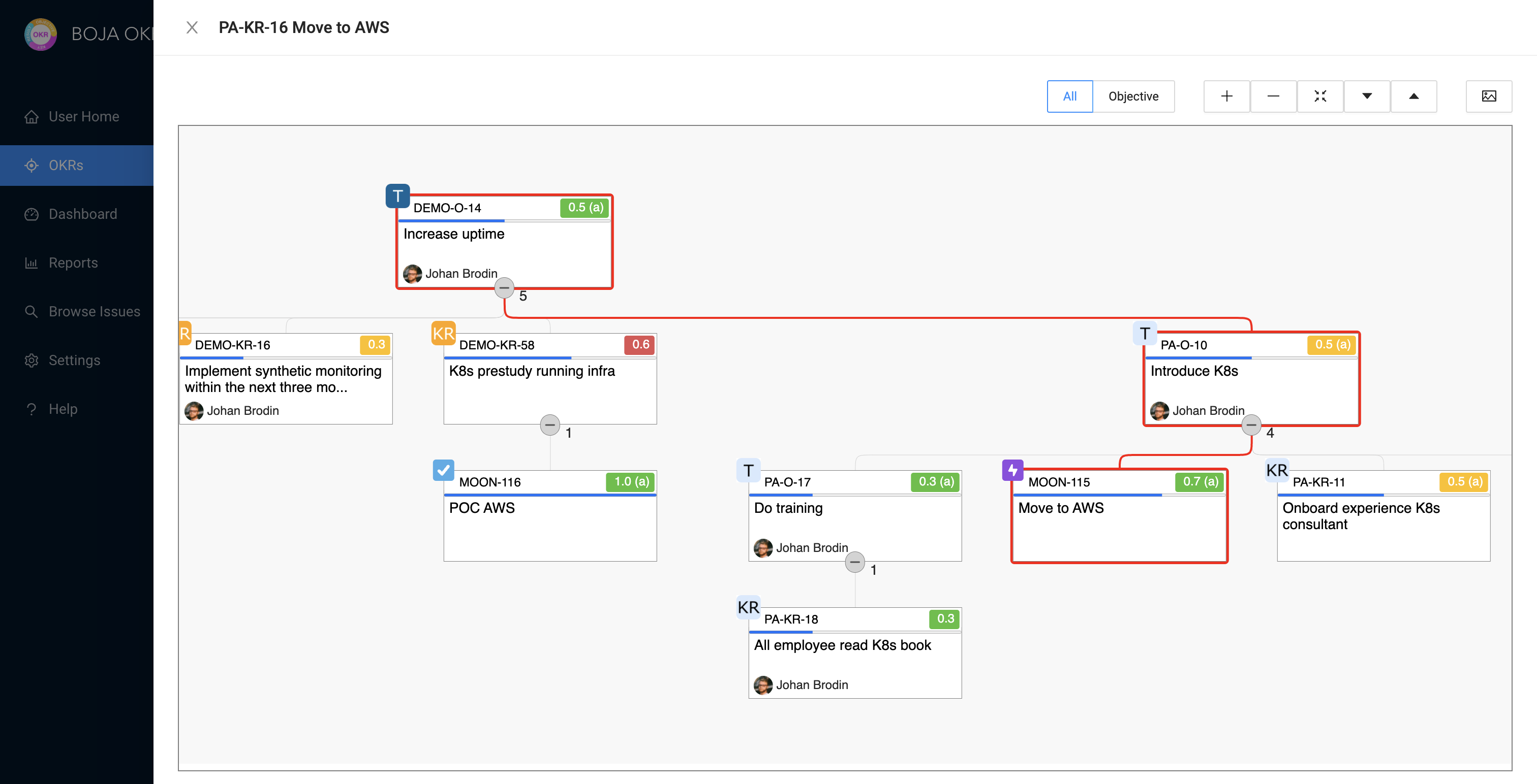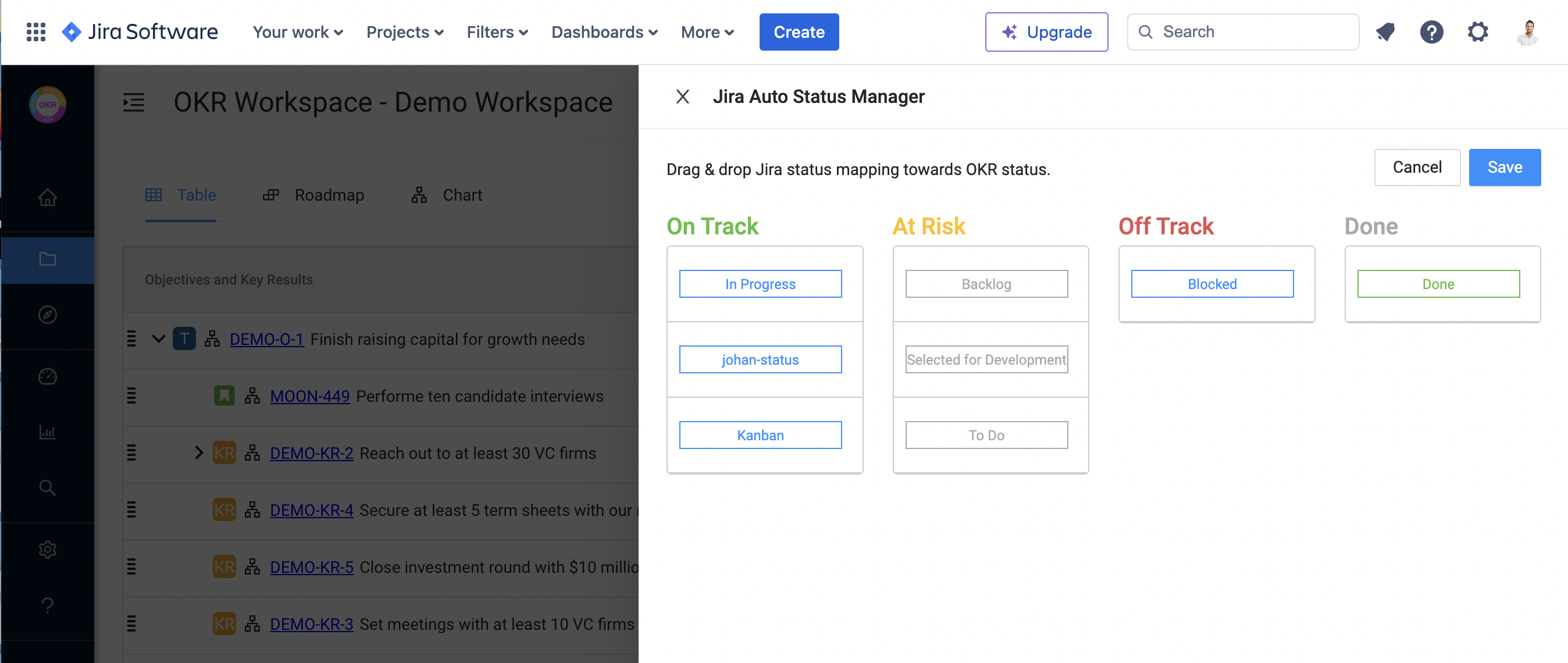 Automatically update OKR status and grade with linked Jira issue progress. As the only OKR solution OKR by BOJA supports auto status update. Configure status based on issue grade or map Jira issue status towards OKR status.