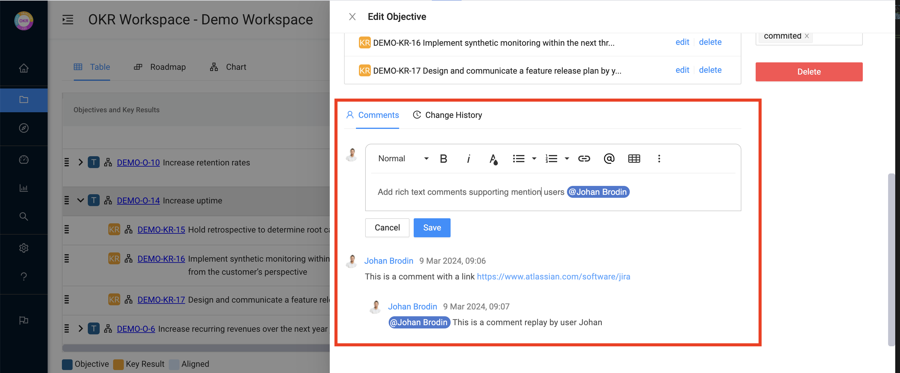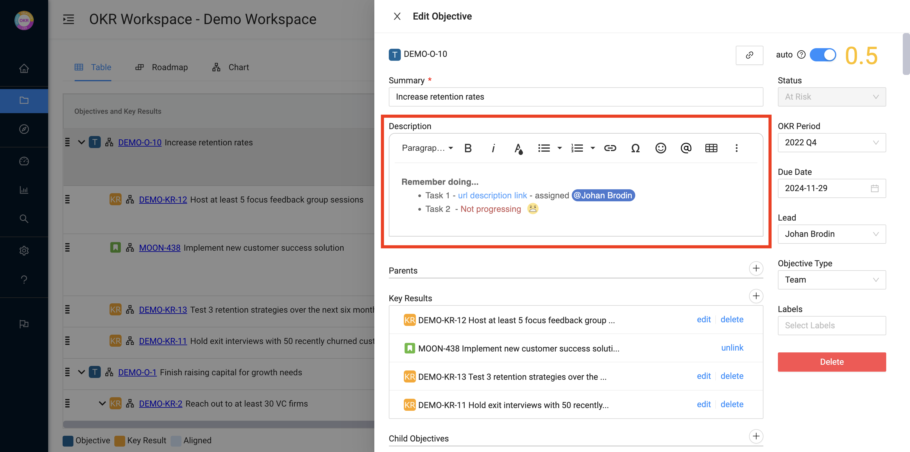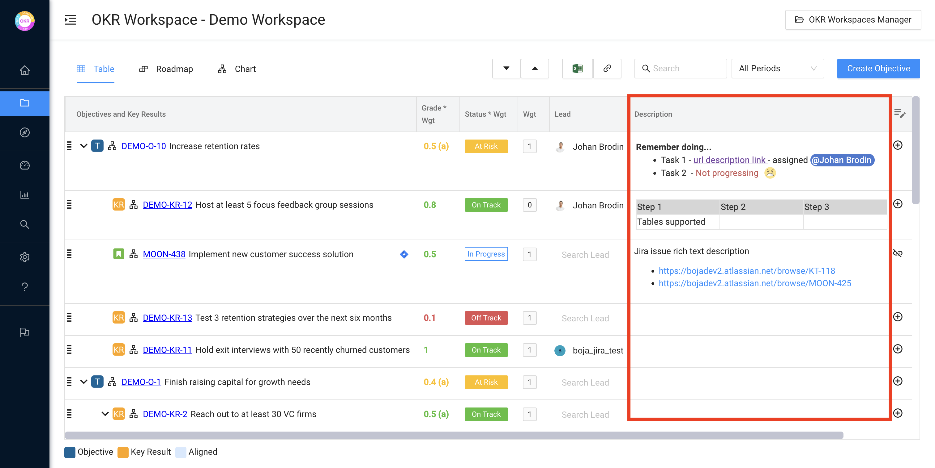 We have integrated the leading WYSIWYG HTML Editor. Easily add rich HTML content to OKR descriptions both in detail and table view.