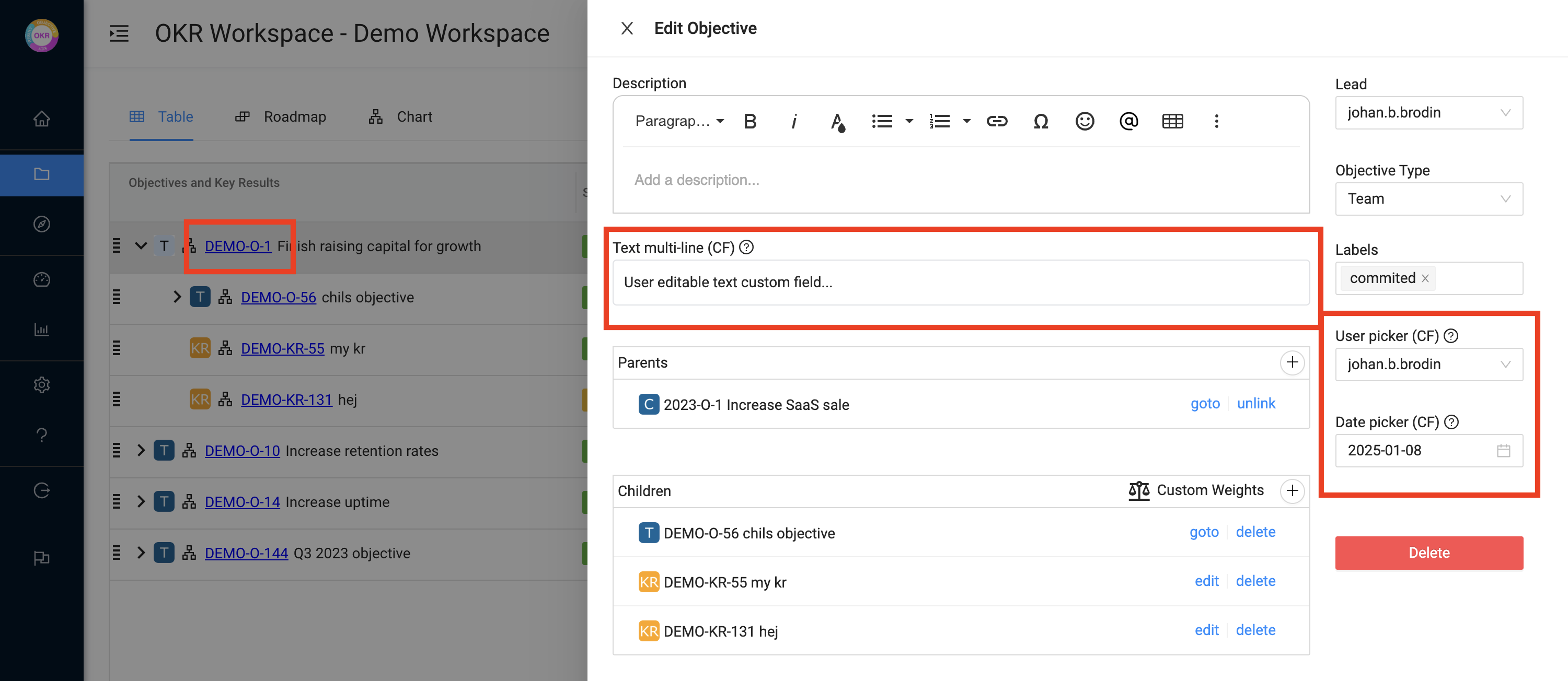 OKR by BOJA now supports custom fields. This is a powerful feature enabling companies to add editable fields into OKRs, Jira issue and tables. Create and manage custom fields in settings.