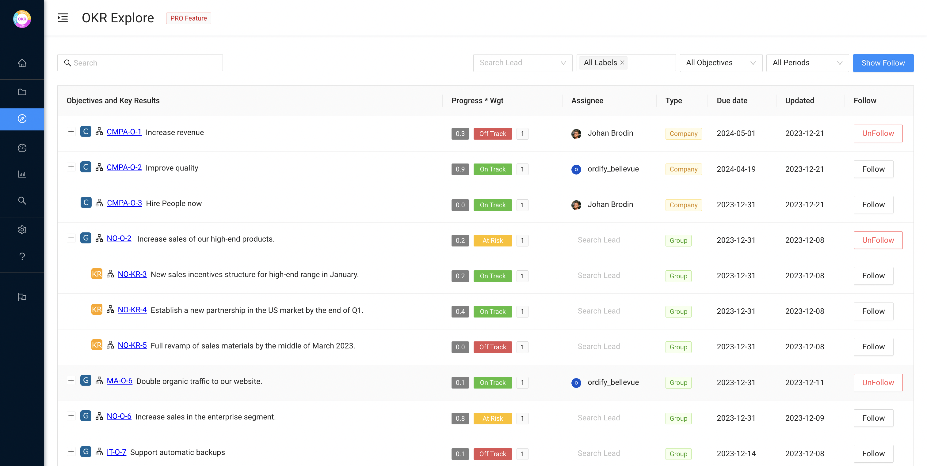 Explore and search among all OKRs in all workspaces. Edit in table or open OKRs in corresponding workspace. Mark and follow individual OKRs.