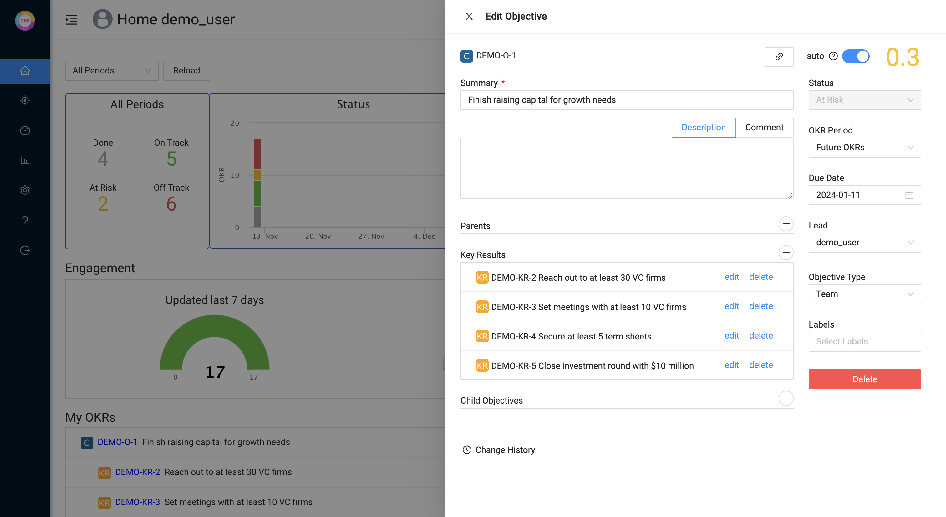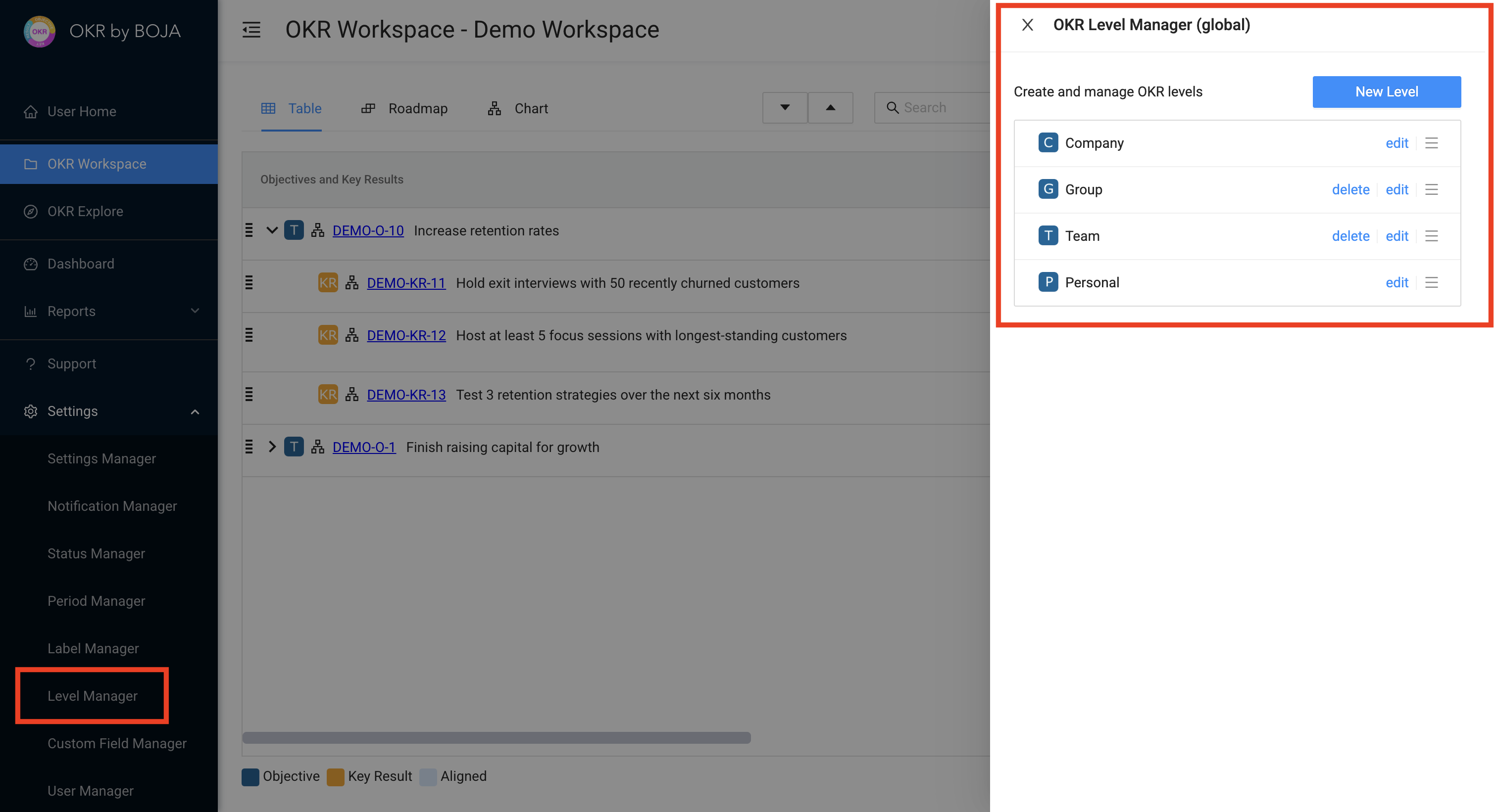 Create and manage OKR levels, enabling companies to map OKRs to its organization structure.