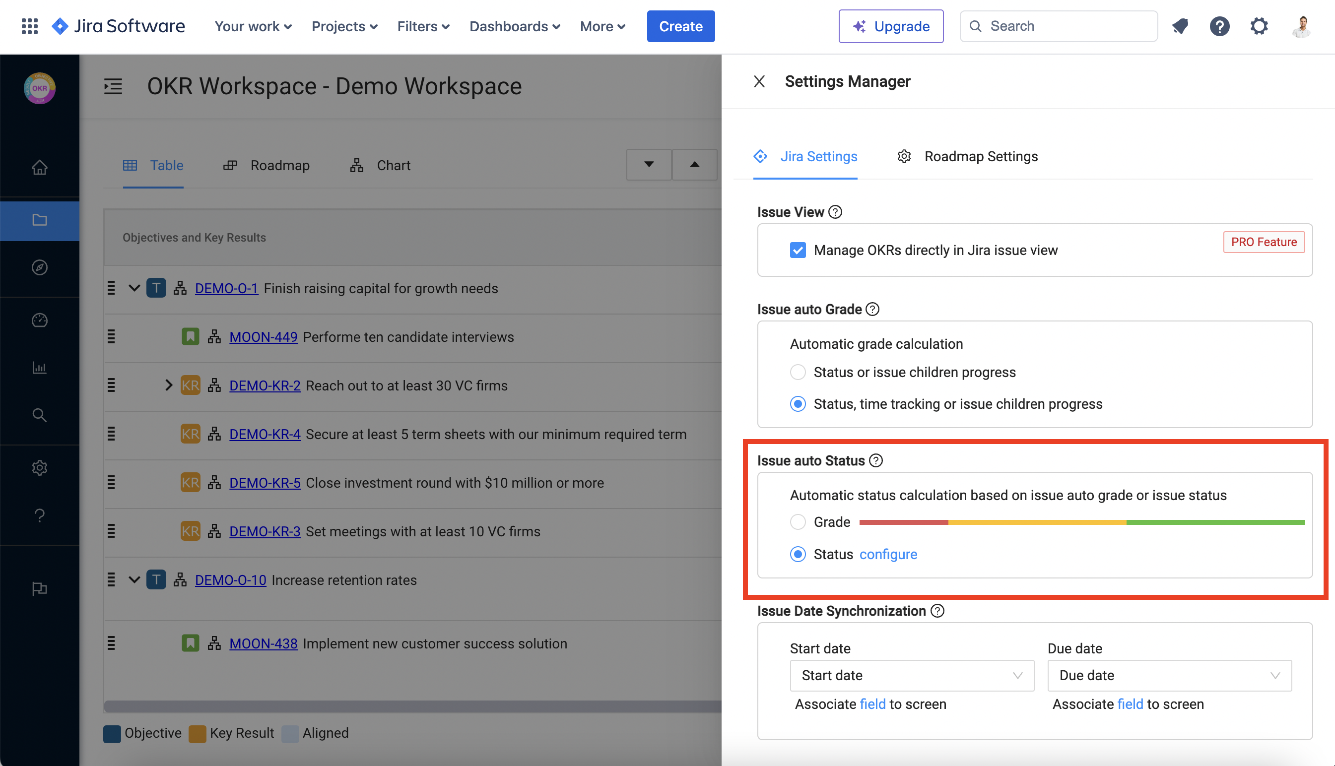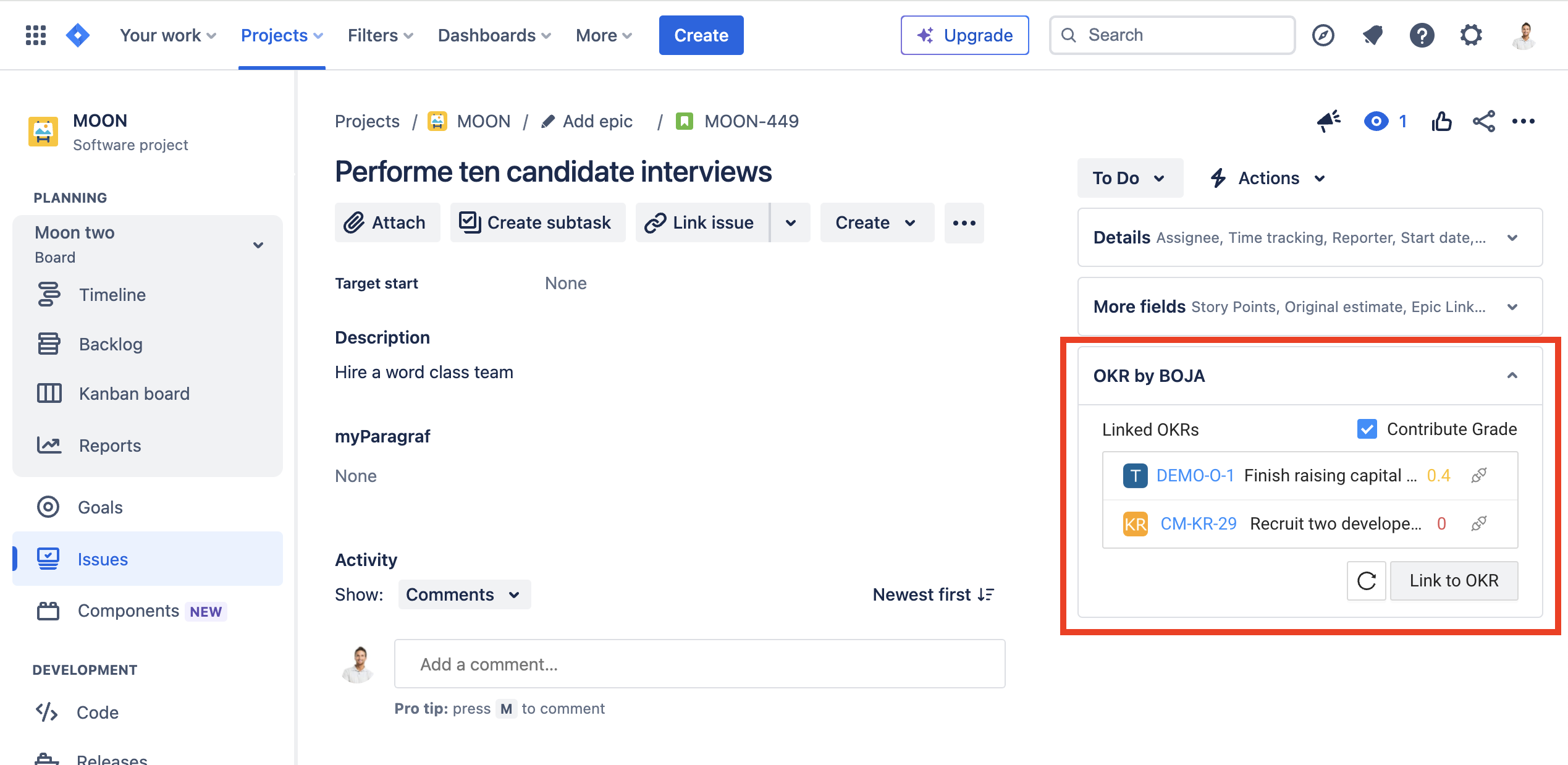 View and manage OKRs directly from the Jira issue view. Please enable this feature in the settings menu.