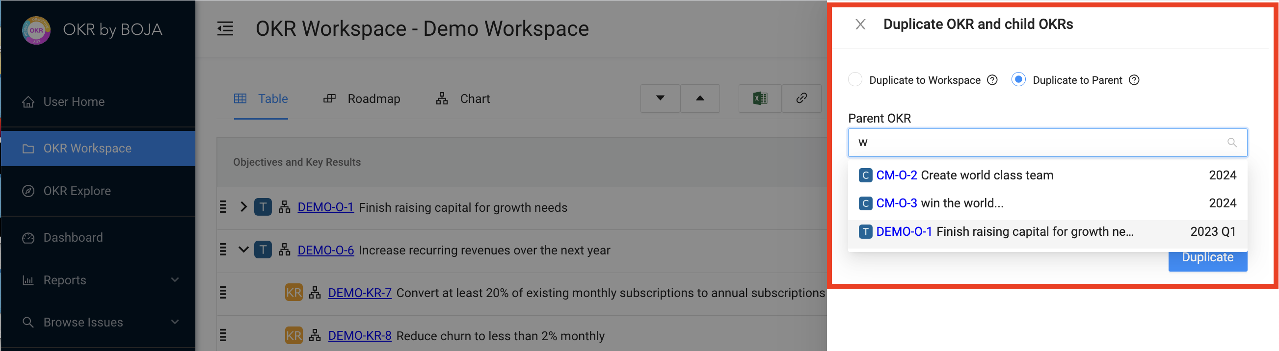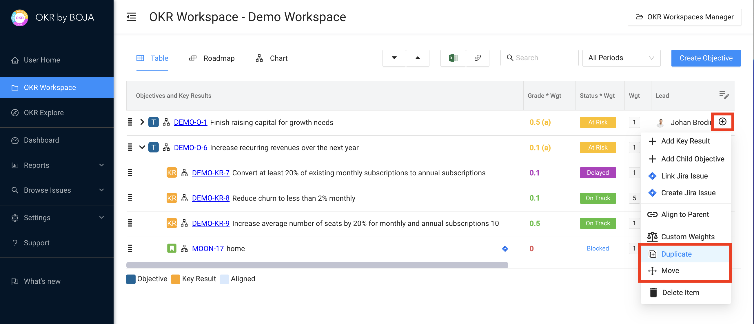 Move and duplicate OKRs in both local and remote workspaces. A typical use case is to reflect when work is moved between teams.