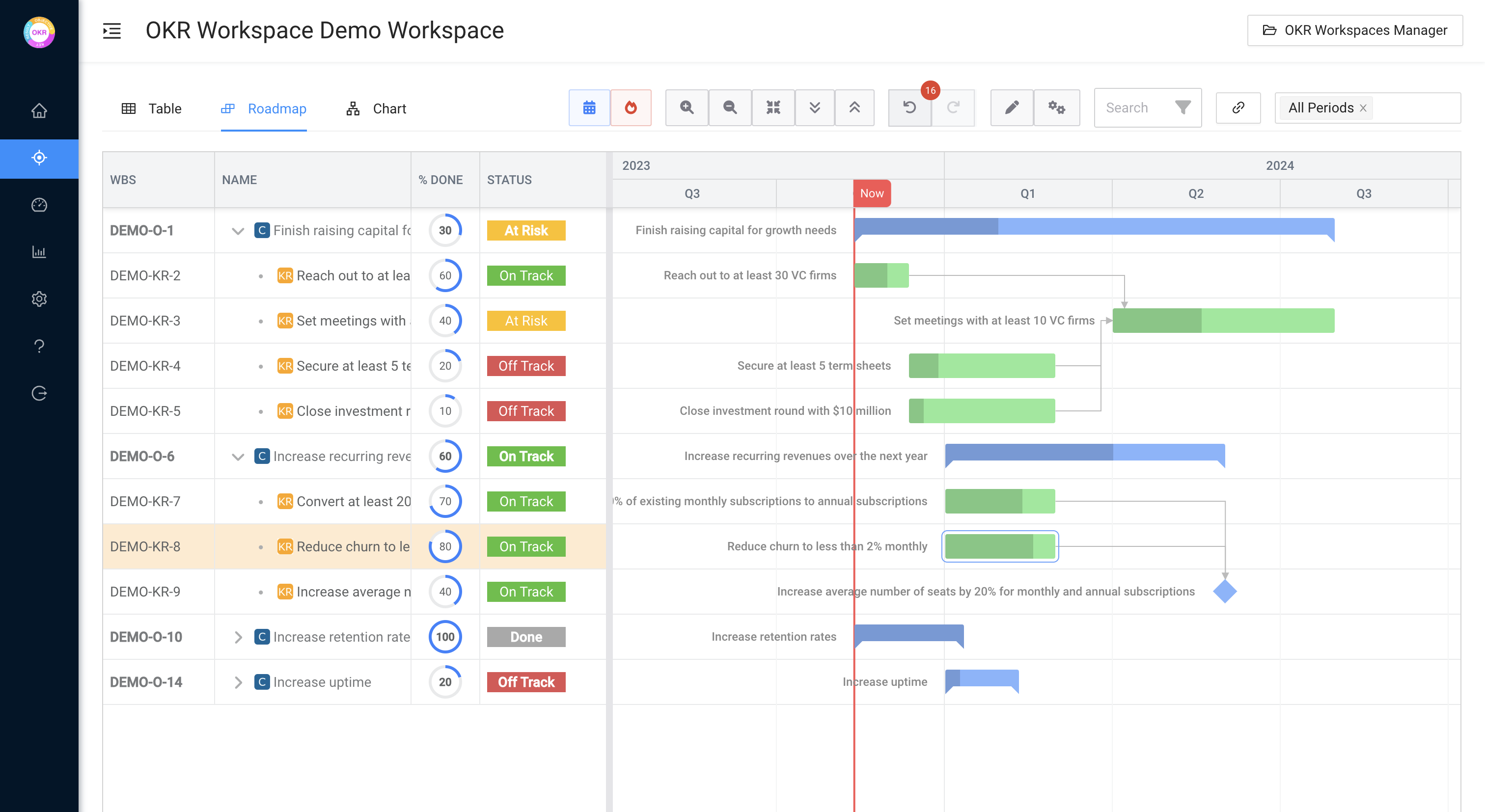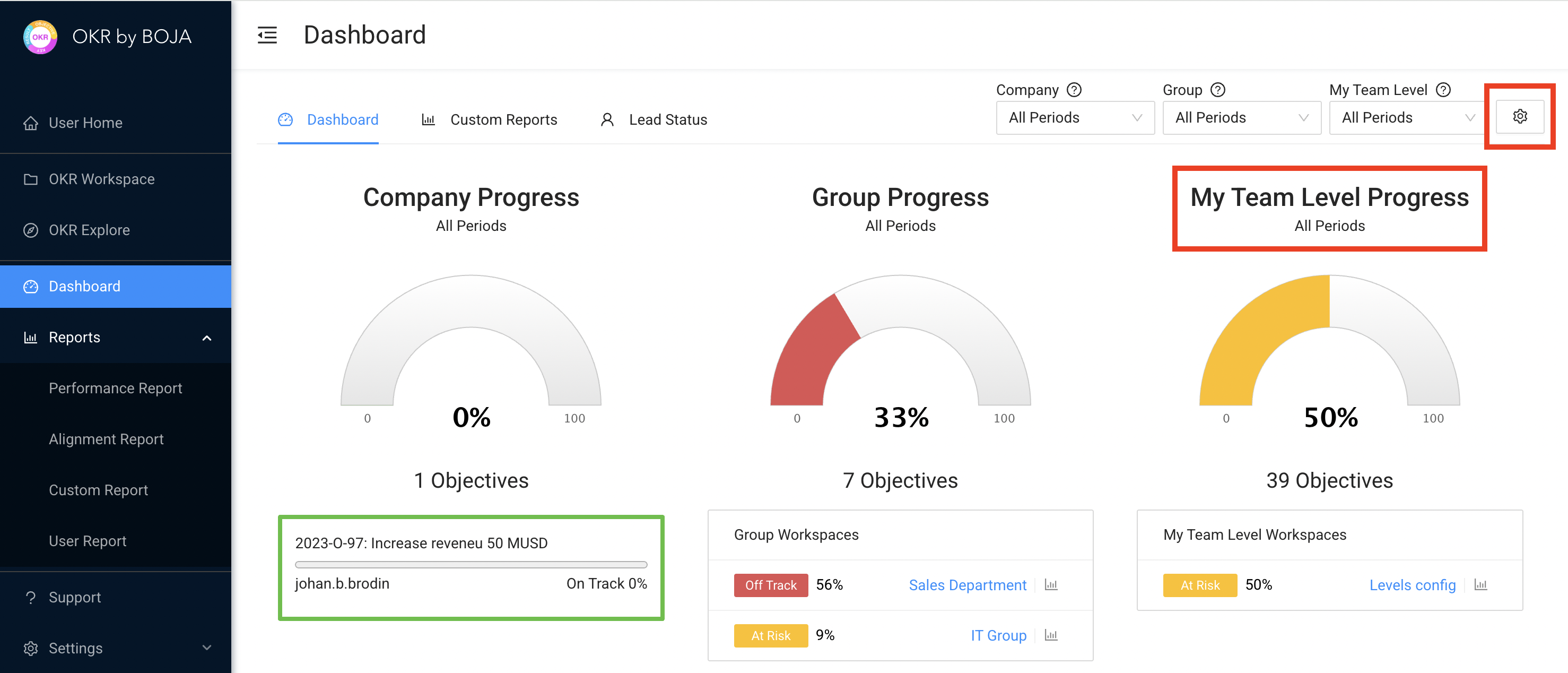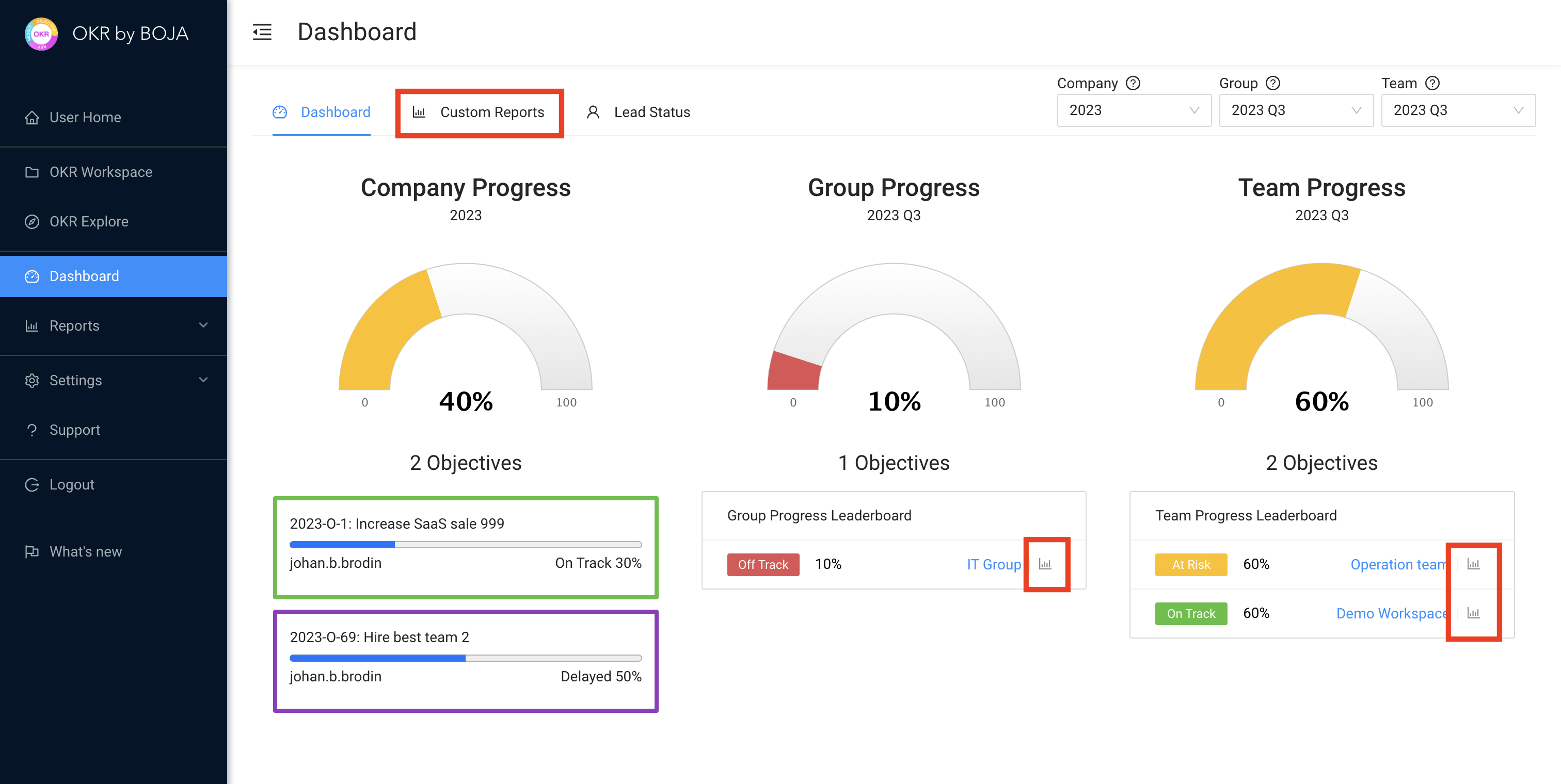 Create powerful custom reports to view the progress of any selection of OKRs and workspaces.