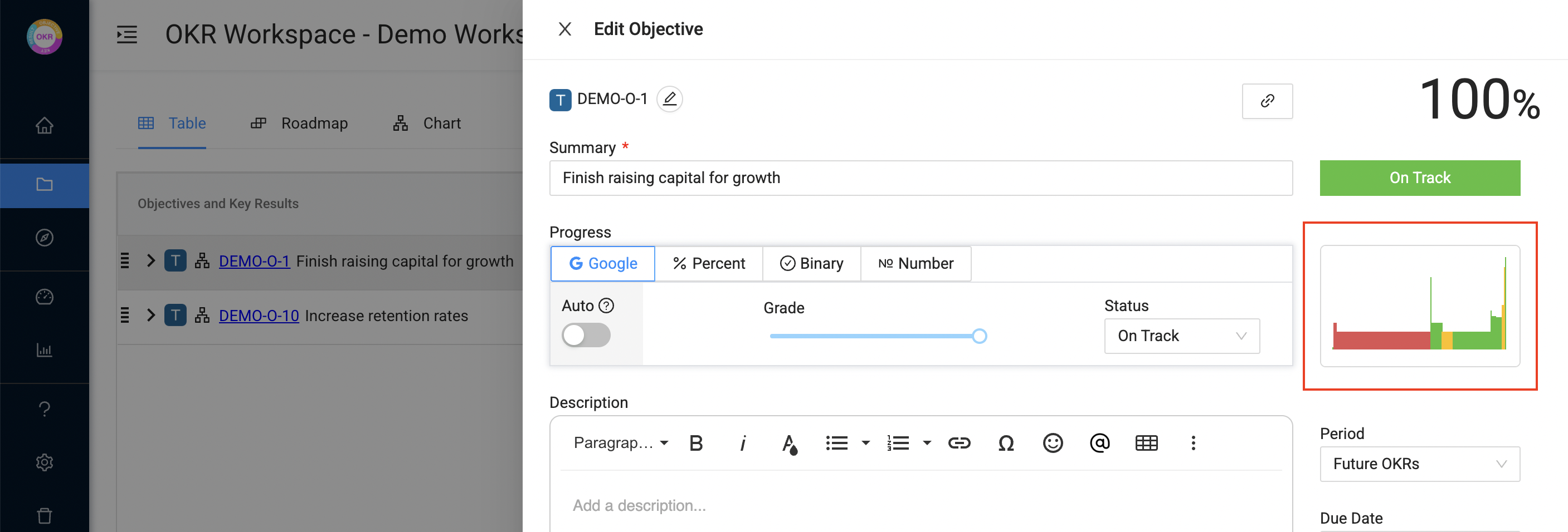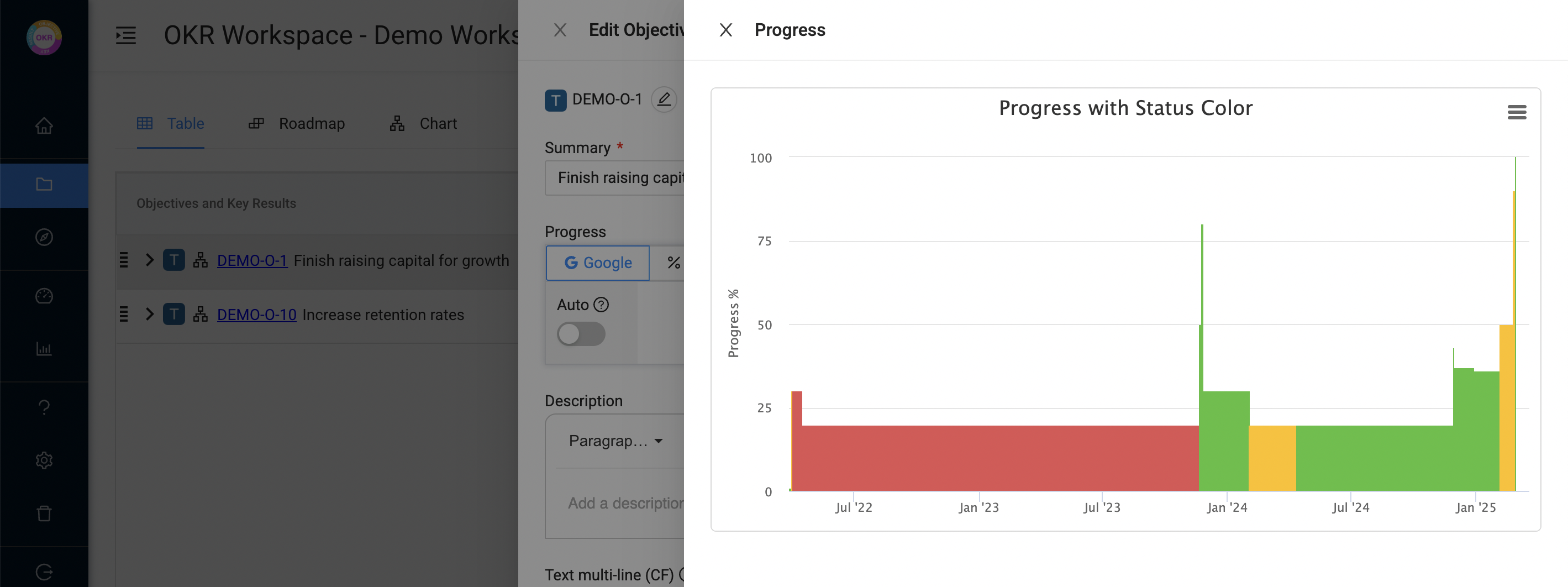 We are happy to announce support of the #1 asked customer feature. Progress widget for OKRs, Jira issues and monday.com items. View grade and status progress over time directly in the detailed view.