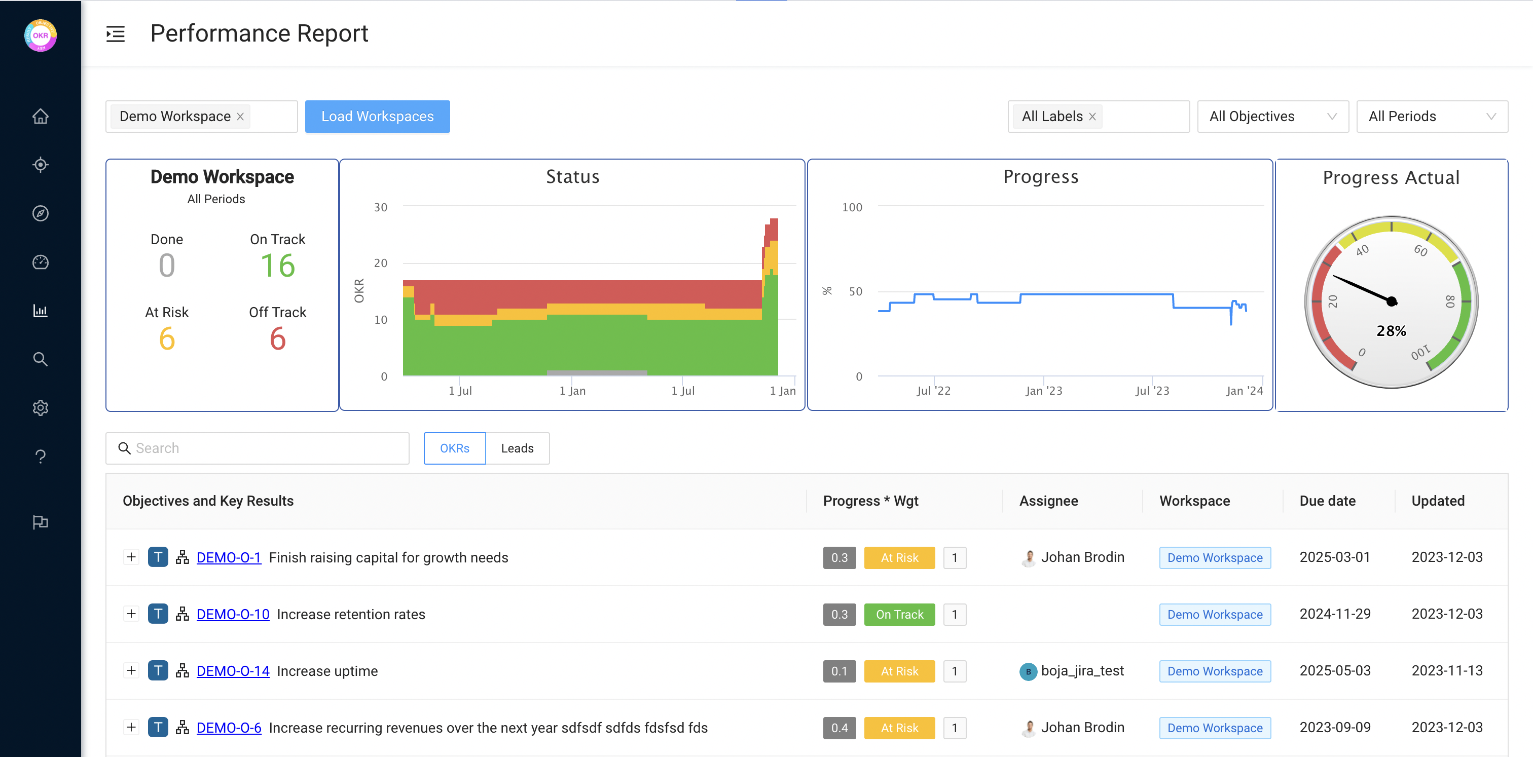 An updated OKR table has been added to the performance report. Quickly view and edit OKRs for one or multiple workspaces.