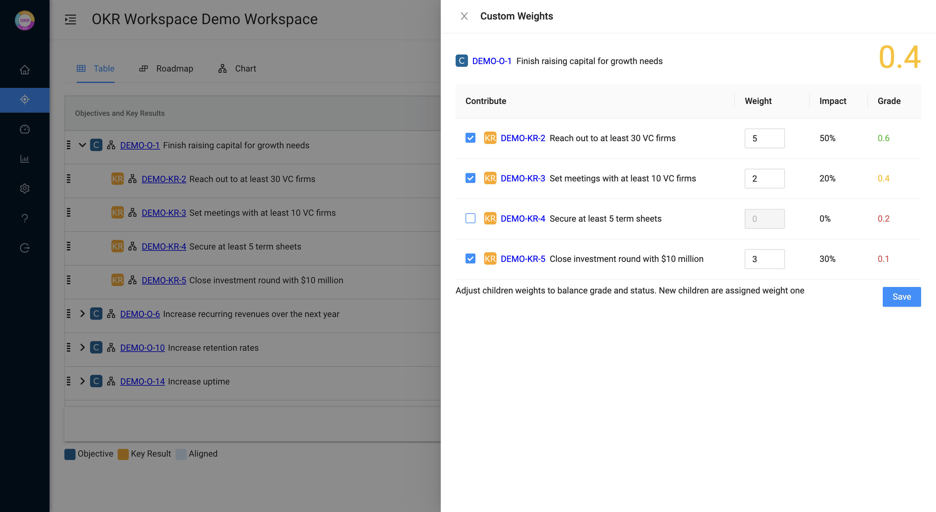 Set custom weights on OKRs to mimic different importance. Custom weights are then used calculating automatic parent grading and status.